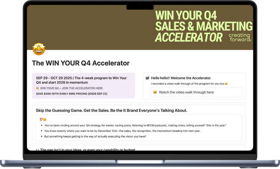This is your 4-week Accelerator for building, optimizing, and executing a sales and marketing strategy that has helped brands double conversion rate during the Holiday Season, and hit multiple-6-figure Q4 sales, with a CMO-level marketer and brand building business coach right by your side.
